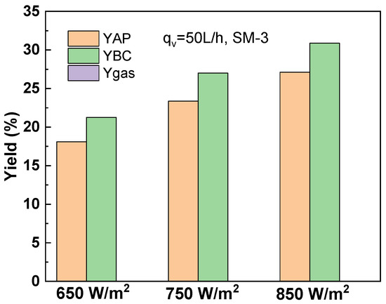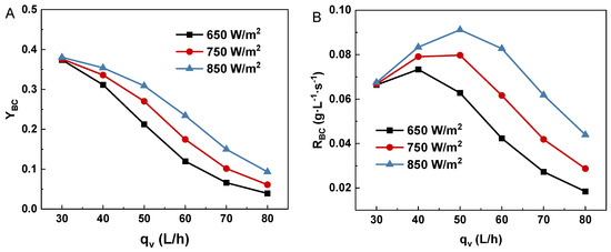 Figure 13 shows the yields of water-soluble organics, biocrude and biogas by the solar-driven reactor at 650, 750 and 850 W/m2, respectively. Owing to the photothermal transformation, the yields of water-soluble organics and biocrude increased with the increase in direct solar radiation from 650 to 850 W/m2. The variations of the biocrude yield under various direct solar radiation levels (650, 750, 850 W/m2) have been shown in Figure 14A. Figure 14B shows the RBC increased with the direct solar radiation from 650 to 850 W/m2. The formation rate of biocrude at 850 W/m2 and 50 L/h (0.091 g·L−1·s−1) was 1.44 and 1.14 times that of 650 and 750 W/m2, respectively. At 750 and 850 W/m2, the optimal conversion rate of biocrude occurred at 50 L/h, whose values were 7.97 and 9.12 g·L−1·s−1, respectively. At 650 W/m2, the optimal formation rate was 7.33 g·L−1·s−1 at 40 L/h. This phenomenon indicated that high thermal energy input guaranteed the high formation rate of algal biomass in the solar-driven reactor.