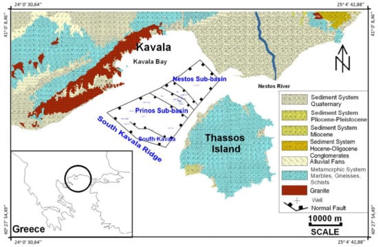 Figure 2) is situated within the Prinos–Kavala offshore basin, located in the North Aegean Sea region, Greece. This geological complex emerged as a tectonic rift during the post-Alpine period, encompassing the “Prinos”, “Epsilon”, and “Prinos North” reservoirs, geographically positioned 8 km west of Thasos Island and 18 km south of Kavala’s primary coastline, within water depths ranging from 30 to 38 m [