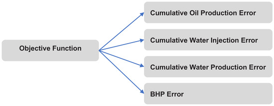 In the case of the “Prinos” field, the history matching process began with an extensive compilation of historic production data, encompassing pressure records, observed oil production and water injection rates, GOR, water–oil ratio (WOR), and their temporal fluctuations for each well. This comprehensive dataset served as the benchmark against which the simulated results were compared and evaluated. Subsequently, the objective function was defined, serving the crucial role of quantifying the error between the simulated results generated by the model and the actual field data, as a function of the adjustable model parameters. The objective function comprises four distinct error components (shown in