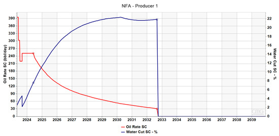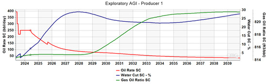 Figure 15), implementing this strategic approach has the potential to significantly increase oil production from Producer 1. Specifically, during the year that water was injected, oil was produced at a rate of 250 stb/day. In January 2025, the initiation of acid gas injection led to an increase in reservoir pressure, thereby facilitating oil production from Producer 1 at the same rate for two more years. Note that, as acid gas is more compressible than water, the increase in pressure is milder compared to the pressure rise induced by water injection. As acid gas is steadily injected into the reservoir, the oil rate begins to decline in 2027, reaching 160 stb/day in 2031, and this level of production is sustained for the following two years. At the end of that period (2033), there was an observed increase in the oil rate, attributed to the recycling of acid gas, including the portion that reaches Producer 1 in 2032. As the simulation period concludes, the oil production rate reaches 225 stb/day, closely resembling the amount of oil produced in the initial years of the acid gas injection scheme. Water cut levels remain consistent with those observed in the previous scenarios.