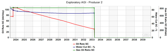 Figure 16 suggests, the oil production rate rises from 76 to 108 stb/day in the year when water injection takes place, and with the assistance of acid gas injection, it is sustained at this level until 2027. Note that acid gas breakthrough in Producer 2 occurs in 2033, one year later than when it reaches Producer 1, which is located closer to the injection well. As pressure depletion progresses, the oil production rate gradually declines until 2033 when it reaches 74 stb/day, approximately the level observed before the implementation of the combined water/acid gas injection strategy. Within the same year, as mentioned above, the operator reinjects acid gas back into the reservoir, resulting in a resurgence in oil production rates. Interestingly, the water cut in Producer 2 becomes significantly lower in this scenario as the acid gas mobility prevails and water feed is not sustained.