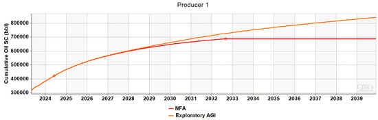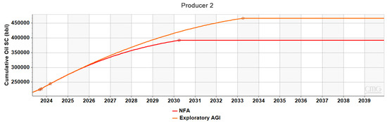 Figure 11 depict the performance of Producers 1 and 2 within the exploratory AGI framework. The production rate limits imposed on the two wells were the same as those applied to the NFA scenario. However, this time, the pressure decline in this particular scenario is more gradual and less pronounced. This slower pressure decline significantly extends the production life of both wells, exceeding the initially projected periods of 10 and 7.5 years for Producer 1 and Producer 2, respectively, according to the NFA scenario. This prolonged lifespan, consequently, sustains oil production rates for an extended period.