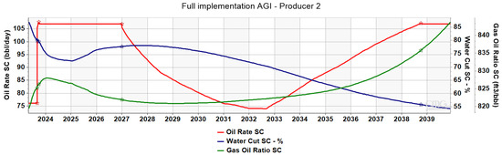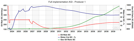 The findings from the simulations of the preceding scenarios highlighted the advantages associated with the example implementation of AGI technology. However, they also revealed a limitation in the energy supply provided by the system, which was deemed insufficient to maintain reservoir pressure effectively to boost production and pursue miscibility. To address this challenge, it was decided that the full implementation scenario would incorporate a short water injection period through Injector 2 to supplement the energy supply and further stabilize reservoir pressure. Water injection was employed for approximately one year before being discontinued to prevent an excessive increase in water cut at Producer 1, which would hinder oil production.