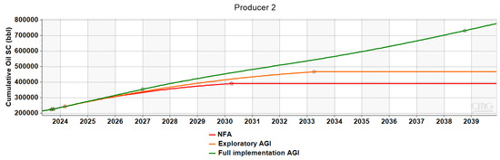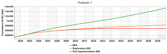 Figure 18 suggest that in the full implementation AGI scenario, the Producer’s cumulative oil production increases by 1.2 MMbbl compared to the NFA case, while Producer 2’s increases by 0.4 MMbbl, thus arriving at a total of 2.6 MMbbl additional oil production.