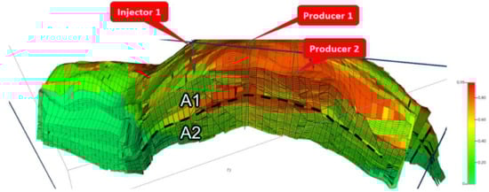 The “Prinos” field comprises three oil reservoirs (A, B, and C), with a total thickness of approximately 300 m. The porosity within these reservoirs varies from 12% to 22%, with an average net-to-gross ratio (NTG) of approximately 60%. Notably, permeability values can reach up to 440 mD. The reservoirs are distinguished by unique oil–water contacts (OWC) located at different depths. These variations in depth allow for the separation and classification of the reservoirs, each presenting its unique challenges and characteristics. Reservoir A, in particular, exhibits an additional level of distinction due to significant heterogeneity in its petrophysical properties and variances in oil characteristics, leading to the further segmentation of Reservoir A into two sub-reservoirs, identified as A1 and A2, with the latter being the reservoir under evaluation for the acid gas injection process. The heterogeneity of the petrophysical characteristics mentioned above further defines distinct layers within reservoirs A1 and A2, four layers for each one. The pore volume of the A1 reservoir is 41.9 MMm3, while that of the A2 reservoir is 22.7 MMm3.