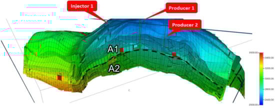 The success of an AGI scheme also requires careful identification of the optimal injection–production well pairs for the pilot scale scheme. The injection well was selected judging from its location and connectivity (i.e., existing perforations) with the target reservoir layers, and is labeled Injector 1. Two candidate production wells, Producers 1 and 2, strategically positioned within the reservoir and with established connectivity to Injector 1 (through past water injection and tracers tests), were also designated.