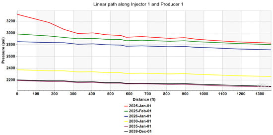 Four years later, the average reservoir pressure along the path under investigation (yellow line) has reached a value of approximately 2300 psi, and the reservoir oil has been saturated in acid gas. The reason for the relatively small pressure drop is that between January 2026 and January 2030, the rate of AGI significantly increased (
