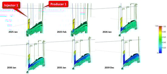 Figure 22 illustrates the variation of oil miscibility within the custom slab over the specified time frames discussed earlier. Note that the custom slab also incorporates the grid blocks where Injector 1 is perforated in the A1 reservoir, where the average oil viscosity stands at 0.76 cp towards the end of the waterflooding phase. However, these perforations are shut off, thus not contributing to the AGI process.