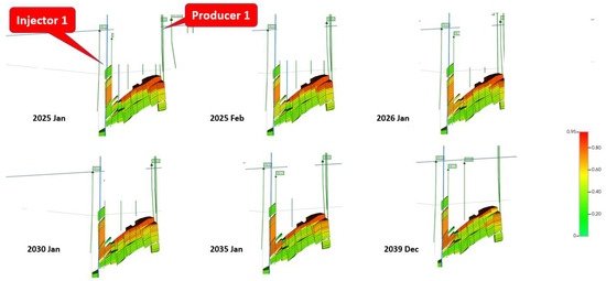 A sharp decline in oil viscosity is observed within the area of interest, dropping from approximately 0.40 cp to 0.20 cp. This viscosity reduction is attributed to the full dissolution of the injected acid gas into the reservoir oil, confirming that miscibility has been achieved. As time advances, the miscibility front extends further across the A2 sand as demonstrated by the blue color expansion towards the producer.