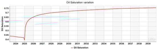 Figure 25 illustrates the variation of oil saturation over time in the grid block of the highest layer in the A2 reservoir, where Injector 1 is perforated. As shown, oil saturation begins increasing gradually from the onset of AGI due to the forward flow of water, reaching a plateau of 0.75 towards the end of the simulated period. No gas appears thanks to the high pressure prevailing in that area.