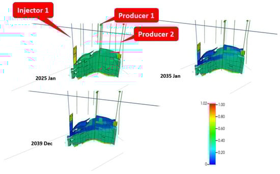 Figure 26 illustrates the evolution of miscibility, focusing on the Injector 1–Producer 2 dipole region, by evaluating the swelled reservoir oil viscosity. Given Producer 2’s proximity to Producer 1, the earlier interpretation also applies to the former. The sole distinction lies in the timing of miscibility’s production benefits, which materialize later in Producer 2 compared to Producer 1 due to its greater distance from the acid gas injector. Notwithstanding this delay, the miscibility effect eventually reaches Producer 2, resulting in enhanced oil production. This underscores the efficacy of miscible gas injection in boosting oil recovery, even in areas farther from the injector.