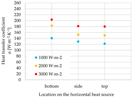 | Location of the Heat Source | Heat Transfer Coefficient α [W·m−2·K−1] | Temperature Decrease ΔT [°C] |