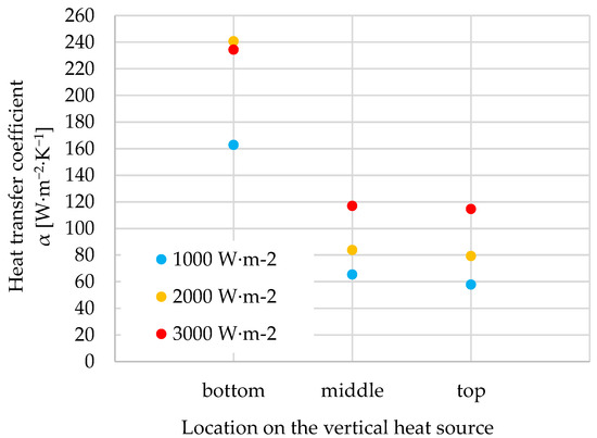 5.4. Heat Transfer Coefficient α at Different Locations of a Vertically Positioned Heat Source