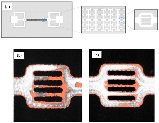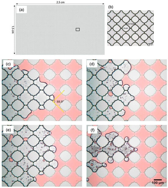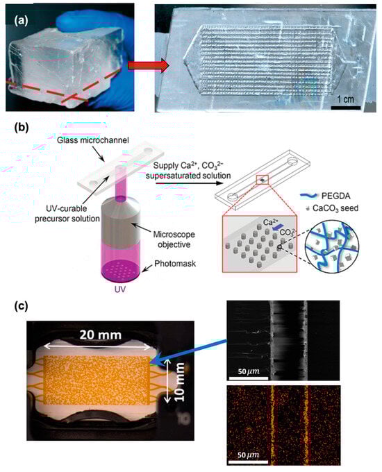 Before discussing the new development in understanding the underlying EOR mechanism, we must clarify the microfluidic reservoir technologies and how they closely mimic the actual reservoir conditions. In the initial phase, the microfluidic platforms of reservoir porous structures were mostly fabricated from glass, silicon, and polymeric materials like PMMA, with well-documented methods like acid etching, lithography, and laser cutting. These models were not able to mimic certain properties of the reservoir, such as different wetting orders and the geochemistry of carbonate or sandstone rocks. However, the new fabrication techniques have removed these limitations. Firstly, actual calcite rock was used to fabricate a 2D porous network by acid itching (Figure 1a) [16]. It enabled the assessment of the geochemical effect of reservoir rock on EOR, along with flow visualization. Later, the in situ growth of CaCO3 crystals in the micromodels was visualized by providing Ca2+ and CO32− ion-rich solutions to the targeted zones in the channels. This process enables the fabrication of synthetic carbonate rock reservoir surfaces in the micromodels (Figure 1b) [17]. A coated CaCO3 nanocrystal layer on the borosilicate surface of the microchannel with a controlled thickness of 1–2 μm (Figure 1c) was used to mimic the reservoir structure [18]. Furthermore, well-established methods like salinization, UV-ozone treatment, and UV-initiated polymer grafting are used to achieve different wetting orders into the micromodels. An article about the tailored wetting order in the same pore network was published. In their study, different polymeric crosslinkers with different ratios of hydrophobic and hydrophilic reactive groups were polymerized via UV exposure, modulating a wide range from 60° to 144° contact angle (Figure 2) [19].