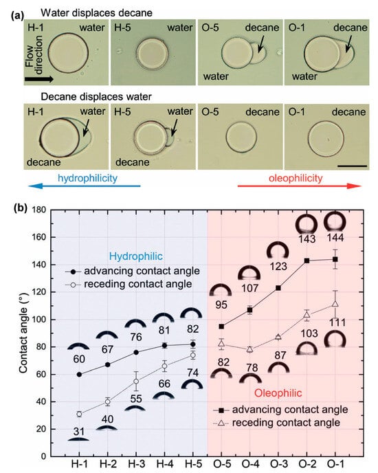 Demonstration of tailored wetting order in microchannel surface. (a) Actual image of hydrophilic and oleophilic surfaces with H-1 being most hydrophilic and O-1 being most oleophilic (scale bar is 100 µm long). (b) The graph shows the image of different contact angles obtained via different polymeric crosslinkers.