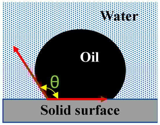 Wettability is defined as the ability of a fluid to stay in contact with a solid surface preferentially to another immiscible fluid present due to intermolecular interactions [20]. The cohesive and adhesive forces describe the intermolecular interaction between solids and liquids. Cohesive force attracts similar molecules; adhesive force attracts different molecules. The balance of adhesive and cohesive forces of the oil–water–rock phase defines the wettability conditions of reservoir rocks [20]. The wettability condition of reservoir rocks is one of the most critical factors influencing fluid flow in porous media, subsequently impacting the overall hydrocarbon recovery efficiency [21]. Based on their wettability characteristics, oil reservoirs are divided into water-wet, oil-wet, mixed-wet, and intermediate-wet.
