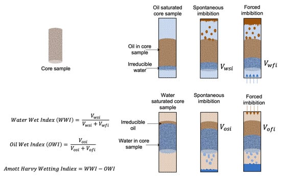Amott–Harvey test: The Amott–Harvey test is an empirical measurement technique involving spontaneous and forced imbibition measurements (Figure 4) [35]. Spontaneous imbibition is a diffusion phenomenon that occurs when the wetting fluid displaces the nonwetting fluid in the pore without external forces. On the other hand, forced imbibition occurs when the wetting fluid displaces the nonwetting fluid with external forces. In this test, spontaneous and forced imbibition are performed consequently with water and oil in an oil-saturated core and water-saturated core, respectively. In all cases, the recovered oil is measured. The data are then used to create water and oil indices by the given equation, leading to water and oil index values ranging from +1 to −1. The index is called the Amott–Harvey index, which is used to assess the wettability of the reservoir (Table 3).
