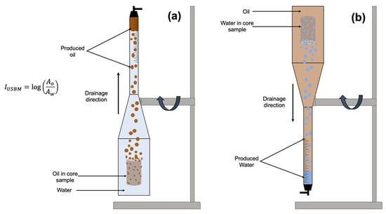 Experimental apparatus for a USBM method. (a) Oil imbibition in the water-wet core sample. (b) Water imbibition in the oil-wet core sample [36].