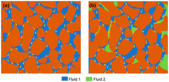 Illustration of permeability. (a) Base permeability of fluid 1. (b) Relative permeability of fluid 1 (permeability of fluid 1 in the presence of fluid 2).