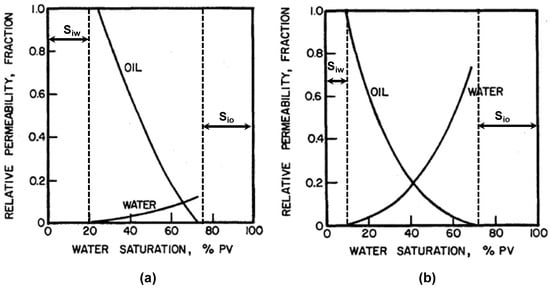 Oil/water relative permeability curves. (a) Strongly water-wet rock; (b) strongly oil-wet rock [51].