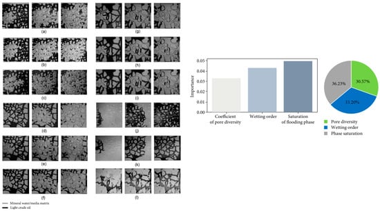 Oil flooding by water in microfluidic platforms with different porosity. Each image set has three images showing the initial condition, during the flooding condition, and after the flooding condition, respectively. The graph shows the importance of pore diversity, wetting order, and phase saturation in oil displacement based on artificial intelligence’s assessment of all the flooding experimental results. Each image set from (a–l) consist of three images showing, initial injection, during injection and after the completion of injection. (a–i) show the flooding of light crude oil at 50, 100, and 150 μL/min, respectively, in each set and with wetting order of 0.872, 3.248, and 6.965 respectively. (j–l) show the same three different flow rates and wetting orders, respectively, with lighter crude oil [55].