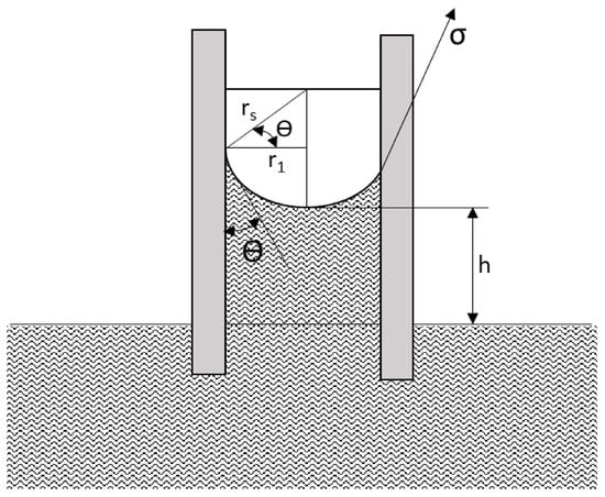 Capillary pressure is the pressure difference between two immiscible fluids at the contact interface when the curved surface forms between them (Figure 9). In the case of oil reservoirs, when the radius of curvature is on the oil side, it is considered positive and vice versa. When the interface is not curved, the capillary pressure is zero [63,64].