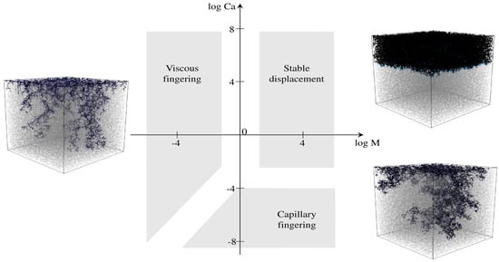 Three regimes, viscous fingering, stable displacement, and capillary fingering, formed during flooding [71].