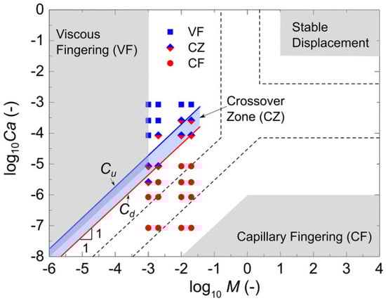 As more displacement fluid has been pushed into the core during the flooding, the capillary number changes and three flow regimes could be formed: stable regime, viscus fingering regime, and capillary fingering flow regime [73]. The stable regime is achieved when the flooding fluid moves forward without any fingering effect. The oil recovery is highest in the stable regime flooding as it does not leave any portion of the core intact. Graphically, these three different regions can be understood with the plot of two non-dimensional numbers called the capillary nu number and mobility ratio, where the capillary number (Ca) is the ratio of viscous drag force, and the interfacial tension, mobility ratio (M) is the ratio of the mobility of invading phase to receding phase (Figure 10).