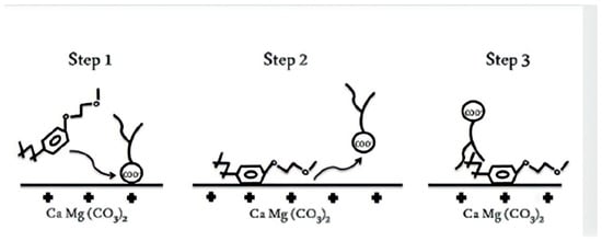 The most common wettability alteration mechanism of nonionic surfactants can be explained with the benzene ring structure (Figure 16) [87]. In the first step, the molecules adsorb on the rock surface via electrostatic forces induced by the polarization of π electrons in the benzene ring. During their adsorption, acid components from the reservoir are swept by surfactants and form a layer to alter wettability. However, the layer can be of different components depending on the structure of the surfactant. With the higher temperature, improvement in the wettability alteration performance of nonionic surfactants is found. But most of the surfactant bonds are not stable above 100 °C [88]. Overall, wettability alteration by nonionic surfactants is weak but reversible.