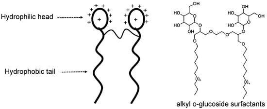 Illustration of a Gemini surfactant with an example of alkyl o-glucoside surfactants [81].