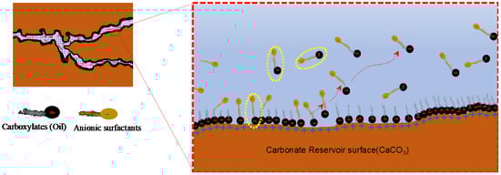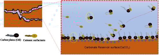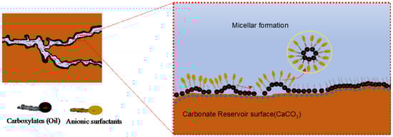 Based on extensive research exploitation on surfactant-assisted EOR, three major phenomena have been commonly identified as wettability alteration mechanisms by surfactants, namely the ion pairing, adsorption, and micellar formation. In general, carbonate reservoirs are mostly composed of calcite, anhydrite, and dolomite, with a positively charged surface [91]. On the other hand, sandstone reservoirs are composed of quartz and feldspar, which makes their surface negatively charged. The oil contains acidic and basic polar organic compounds [92]. Therefore, based on the affinity of the reservoir surface charge, the carboxylate group (negatively charged acidic polar organic compound (POC)) or nitrogen-containing aromatic molecules (positively charged basic POC) of the oil become adsorbed to the reservoir surface and become oil-wet.
