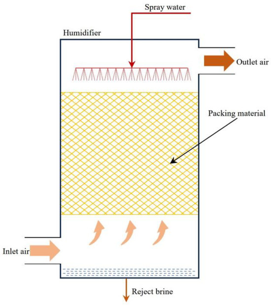 The global shortage of freshwater resources stands as a paramount factor constraining both economic development and the enhancement of people’s quality of life. Desalination, which is the process of converting saltwater into freshwater, is widely regarded as one of the most effective methods to cope with the shortage of freshwater resources [1]. Among the current commercial desalination systems, reverse osmosis (RO), multi-effect distillation (MED), and multi-stage flash (MSF) desalination systems, which demand substantial energy and electricity, are better suited for large-scale industrial water applications (thousands of cubic meters per day) [2]. Humidification–dehumidification (HDH) desalination systems are characterized by their energy efficiency, cost-effectiveness, and adaptability to a wide array of energy sources. They can prove particularly adept at meeting the freshwater supply needs of decentralized and small- to medium-scale applications, especially in remote or offshore island areas [3,4]. In the realm of decentralized water supply, HDH desalination systems present a compelling case for their adoption due to their energy efficiency, scalability, flexibility, and lower environmental impact. An HDH system is uniquely capable of operating effectively with low-grade heat sources such as solar thermal energy or waste heat from industrial processes. This makes it more efficient than other desalination methods like RO or MSF, which require high-grade electrical or thermal energy. The scalability and flexibility of HDH systems are also notable. They can easily be adjusted to meet water demand, making them ideal for decentralized applications. They can also be combined with other renewable energy systems to create hybrid systems that enhance performance and reliability. In terms of environmental impact, HDH systems outshine other desalination methods. They eliminate the need for high-pressure pumps or chemical additives, which are often associated with significant environmental concerns. However, it is important to recognize that the performance and cost-effectiveness of an HDH desalination system depends on various factors, including the availability and cost of heat sources, local climate conditions, and specific design and operating parameters. To optimize HDH desalination systems, several studies have mainly focused on enhancing system performance by making structural improvements and utilizing the condensation–evaporation heat of heat pump systems to increase their energy utilization efficiency, thus improving the freshwater production performance [5,6,7]. Secondly, the selection of appropriate packing materials can significantly improve the contact area and duration between the spray water and air entering the humidifier, thus enhancing the heat–mass transfer effect, improving the humidification efficiency of the humidifier, and consequently improving the energy efficiency of the freshwater production system [8,9,10].