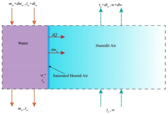 The heat and mass transfer relationship between air and spray water in the control body is illustrated in Figure 2. At the interface between the air and water, there exists an extremely thin layer of saturated air. Within the boundary layer, the temperature of the air is equal to the temperature of the water. At the boundary layer, the low-temperature air receives heat and mass from the high-temperature spray water [23].