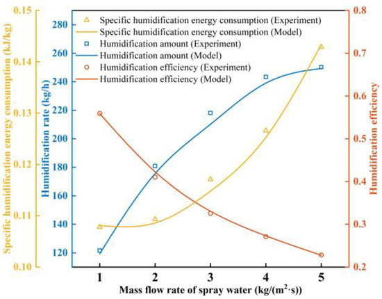 To validate the accuracy and reliability of the model proposed in this study, a comparison was made with experiments conducted by Zhang et al. [29] using polypropylene as a packing material. The primary parameters of the main devices in the humidification device are shown in Table 2. The parameters of the measuring instruments for spray water and air are shown in Table 3. The relevant comparison results are shown in Figure 3. It is observed that under the same operating conditions (air mass flow rate of 1.0 kg/(m2s); spray water temperature of 50 °C; air dry bulb temperature and relative humidity of 16 °C and 10%, respectively), the average errors in mhum, εhum, and ηhum are 1.39%, 0.35%, and 0.85%, respectively. The results indicate a strong agreement between the simulation and experimental results, highlighting the model’s high accuracy and credibility. After the accuracy of the model was verified, the relevant operating parameters of the system were changed to analyze the humidification performance of different packing materials.