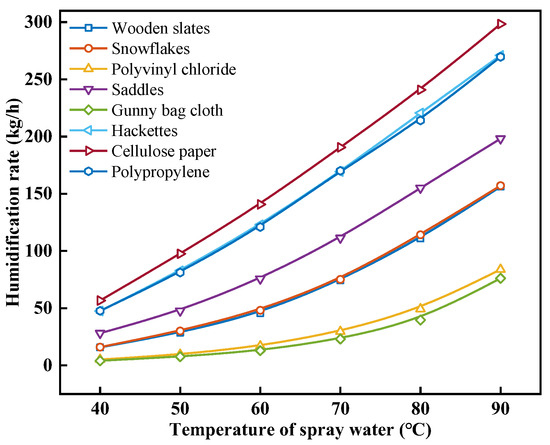 When analyzing the change in humidification performance with spray water temperature with different packing materials, the inlet air and spray water mass flow rates were set to 0.4 kg/s, and the inlet ta was set to 30 °C. Figure 4 shows the effect of the spray water temperature on the humidification rate with different packing materials. As shown in Figure 4, when the tw values are the same, the mhum values of different packing materials from large to small are in the following order: cellulose paper, hackettes, polypropylene, saddles, snowflakes, wooden slats, polyvinyl chloride, and gunny bag cloth. Taking the tw of 60 °C as an example, cellulose paper has the largest mhum of 140.69 kg/h, and gunny bag cloth has the smallest mhum of 12.85 kg/h. Equation (18) indicates that this difference is mainly due to the combined effects of the packing material parameters a, b, and Spm. Under the same operating conditions, cellulose paper has the highest mass transfer coefficient, leading to more efficient heat and mass transfer between air and spray water, resulting in the highest mhum. With the increase in tw, the mhum of various packing materials shows an increasing trend. When the tw increases from 40 °C to 90 °C, the mhum of wooden slats, snowflakes, polyvinyl chloride, saddles, gunny bag cloth, hackettes, cellulose paper, and polypropylene increases from 15.70, 15.92, 5.04, 28.10, 4.04, 47.50, 56.61, 47.67 kg/h to 156.22, 157.11, 83.77, 198.22, 76.08, 271.01, 298.40, and 269.72 kg/h, with an increase of 9.95, 9.87, 16.61, 7.05, 18.81, 5.71, 5.27, and 5.66 times, respectively. This may be due to the increase in the tw leading to an increase in the temperature difference between the spray water and the air, thus improving the efficiency of the heat and mass transfer between the spray water and the air in the humidifier. As the ta increases, the saturated vapor pressure of the moister air also increases, further enhancing the ability of the air to absorb water vapor, so more heat and mass from the spray water are transferred to the air, effectively increasing the mhum. Therefore, raising the tw can significantly increase the mhum of the humidifier.