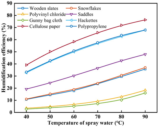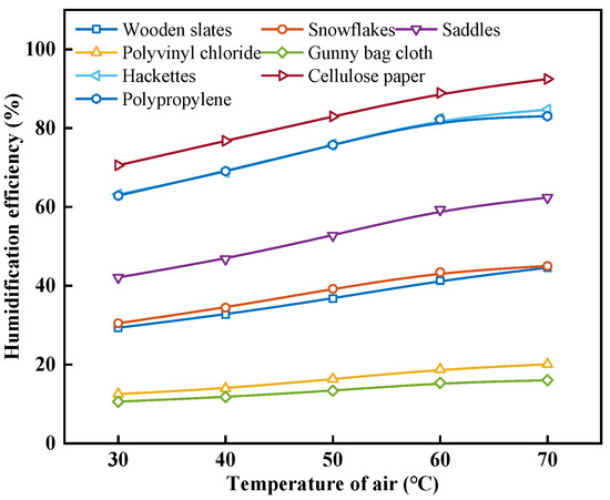 Figure 11 shows the effect of the air temperature on the humidification efficiency with different packing materials. As can be seen from Figure 11, under the same operating conditions, cellulose paper exhibits the highest εhum, and with the increase in ta, the εhum of all packing materials increases. When the ta increases from 30 °C to 70 °C, the εhum of wooden slats, snowflakes, polyvinyl chloride, saddles, gunny bag cloth, hackettes, cellulose paper, and polypropylene increases from 29.32%, 30.48%, 12.50%, 42.10%, 10.57%, 63.16%, 70.56%, and 62.87% to 44.59%, 45.01%, 20.03%, 62.36%, 16.00%, 84.70%, 92.46%, and 83.04%, with an increase of 52.08%, 47.66%, 60.33%, 48.13%, 51.41%, 34.10%, 31.04%, and 32.08% for the respective packing materials. This is because, as shown in Figure 10, with the increase in the inlet ta, the rate of increase in the outlet air enthalpy decreases. Therefore, though the εhum increases, the magnitude of the improvement becomes gradually smaller.