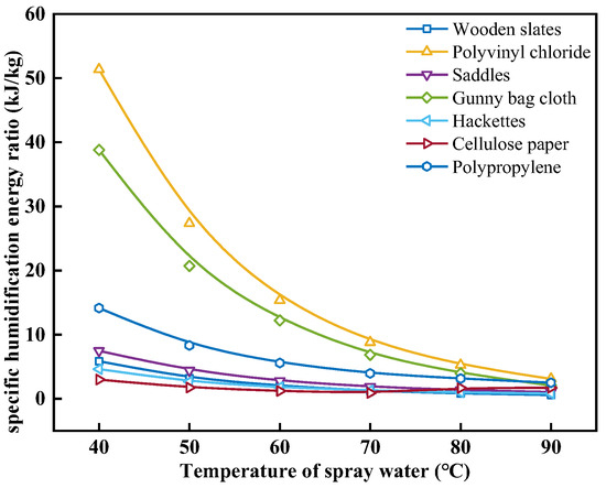 Effect of spray water temperature on the specific humidification energy ratio with different packing materials.