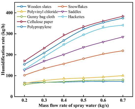 When analyzing the change in humidification performance with the mass flow rate of spray water with different packing materials, the inlet air mass flow rate was set to 0.4 kg/s, and the inlet temperatures of air and spray water were set to 30 °C and 90 °C. Figure 7 shows the effect of the mass flow rate of spray water on the humidification rate. As can be seen from Figure 7, under the same operating conditions, the mhum values from highest to lowest are in the following order: cellulose paper, polypropylene, hackettes, saddles, snowflakes, polyvinyl chloride, gunny bag cloth, and wooden slats. From Equation (18), it is evident that the difference in mhum between different humidifiers is determined by the physical properties of the packing material, which include Spm, a, and b. As the mw increases, the mhum of each packing material also increases, but the rate of increase diminishes. When the mw is increased from 0.2 kg/s to 0.7 kg/s, the mhum values for wooden slats, snowflakes, polyvinyl chloride, saddles, gunny bag cloth, hackettes, cellulose paper, and polypropylene increase from 65.71, 101.97, 63.90, 126.41, 57.39, 130.43, 170.32, and 153.94 kg/h to 72.79, 219.03, 100.15, 285.05, 80.07, 340.89, 383.63, and 374.59 kg/h, respectively. This is because increasing the mw can enhance the heat and mass transfer efficiency between the spray water and air in the humidifier, promoting the heat and mass transfer process between the air and spray water on the packing material’s surface. This leads to an increase in the temperature and humidity of the air at the outlet of the humidifier. However, when the temperature and humidity of the air at the humidification packing material’s surface increase with an increase in mw, the temperature difference between the air and spray water, as well as the saturation vapor pressure difference between the humid air and the saturated humid air boundary layer on the humidifier’s surface water film, decreases. This reduction is not conducive to the heat and mass transfer process between the air and spray water on the packing material’s surface, and this adverse effect increases with an increase in ma.