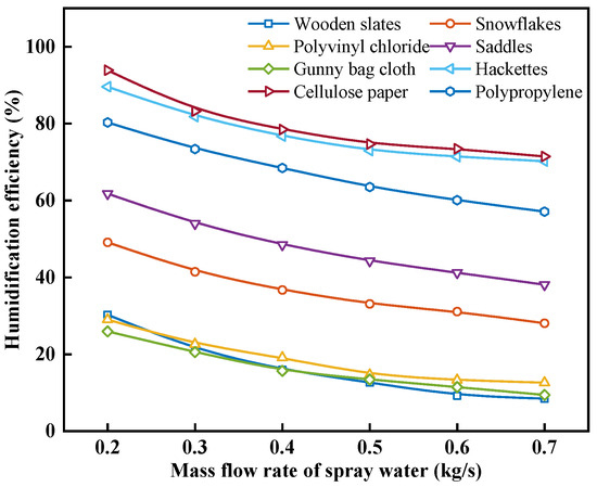 Figure 8 shows the effect of the mass flow rate of spray water on the humidification efficiency with different packing materials. As can be seen from Figure 8, under the same operating conditions, the εhum of cellulose paper is the largest, and with the increase in mw, the εhum of each packing material is reduced, but the magnitude of the reduction is different. The εhum of hackettes is the smallest with the reduction in mw, followed by cellulose paper. When the mw is increased from 0.2 kg/s to 0.7 kg/s, the εhum for wooden slats, snowflakes, polyvinyl chloride, saddles, gunny bag cloth, hackettes, cellulose paper, and polypropylene decreases from 30.25%, 49.10%, 28.98%, 61.79%, 25.91%, 89.59%, 93.86%, and 80.31% to 8.43%, 28.06%, 12.58%, 38.08%, 9.39%, 70.21%, 71.45%, and 57.09%, with a reduction of 72.15%, 42.85%, 56.58%, 38.37%, 63.75%, 21.63%, 23.88%, and 28.91%, respectively. This is because, as analyzed in Figure 7, with the increase in mw, the magnitude of the heat and mass transfer between the air and spray water decreases. However, the increase in mw is linear. Consequently, the outlet temperature of the spray water rises, leading to a reduction in εhum, as indicated by Equation (22).