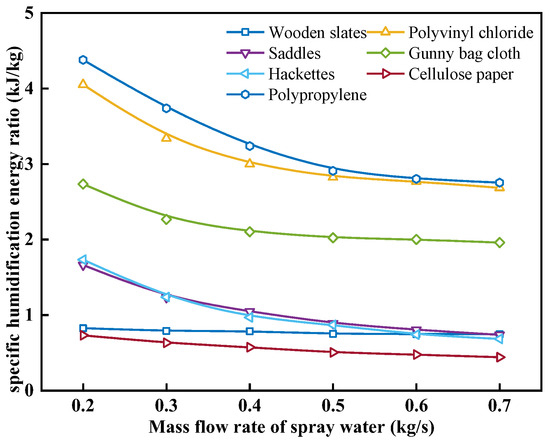 Effect of mass flow rate of spray water on the specific humidification energy ratio with different packing materials.