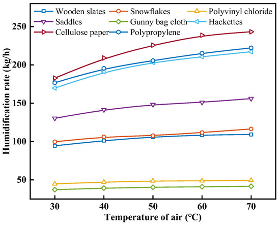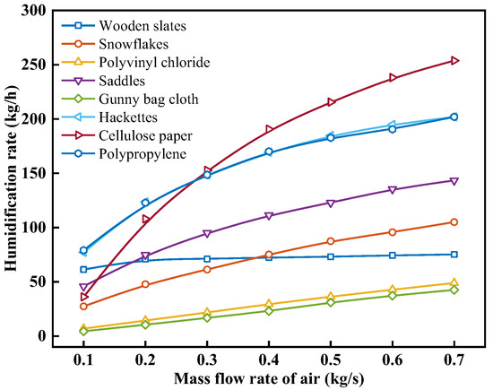 When analyzing the change in humidification performance with air temperature with different packing materials, the inlet spray water temperature was set to 80 °C, and the inlet air and spray water mass flow rates were set to 0.4 kg/s. Figure 10 shows the effect of the air temperature on the humidification rate with different packing materials. As can be seen from Figure 10, under the same operating conditions, the mhum values from highest to lowest are in the following order: cellulose paper, polypropylene, hackettes, saddles, snowflakes, wooden slats, polyvinyl chloride, and gunny bag cloth. As the ta increases, the mhum of various packing materials increases, but the extent of the increase gradually diminishes. When the ta rises from 30 °C to 70 °C, the mhum of wooden slats, snowflakes, polyvinyl chloride, saddles, gunny bag cloth, hackettes, cellulose paper, and polypropylene increases from 94.44, 99.67, 44.68, 130.32, 37.07, 169.77, 182.78, and 176.70 kg/h to 109.22, 116.39, 49.24, 155.98, 41.52, 217.19, 243.23, and 222.16 kg/h, with an increase of 15.65%, 16.77%, 10.21%, 19.69%, 11.98%, 27.94%, 33.07%, and 25.73%, respectively. The mhum for cellulose paper at a ta of 30, 40, 50, 60, and 70 °C is 182.78, 209.08, 225.78, 238.73, and 243.23 kg/h, respectively. This is because increasing the ta enhances the heat and mass transfer efficiency between the air and the spray water, promoting the heat and mass transfer process between the air and the spray water on the surface of the packing material. Consequently, this results in an increase in both the temperature and moisture content of the air at the humidifier outlet. However, as the ta increases, the temperature difference between the air and the spray water decreases. This reduction leads to a decrease in the difference in moisture content between the saturated air boundary layer and the air. This is unfavorable for the heat and mass transfer between the air and the spray water. Additionally, at a higher ta, this unfavorable effect becomes more pronounced. Therefore, with the rise in ta, the mhum shows an increasing trend, but the growth rate of this trend gradually slows down.
