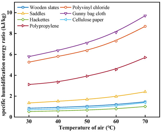 Effect of air temperature on specific humidification energy ratio with different packing materials.