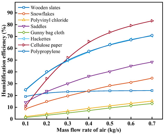 Figure 14 shows the effect of the air mass flow rate on the humidification efficiency with different packing materials. As can be seen from Figure 14, the εhum for each type of packing material increases with the increase in ma. When the ma is increased from 0.1 kg/s to 0.7 kg/s, the εhum of wooden slats, snowflakes, polyvinyl chloride, saddles, gunny bag cloth, hackettes, cellulose paper, and polypropylene increases from 19.15%, 8.63%, 2.10%, 14.18%, 1.37%, 24.45%, 11.00, and 24.91% to 24.20%, 34.68%, 15.27%, 48.38%, 13.18%, 70.51%, 83.25, and 70.94%, with an increase of 26.36%, 301.99%, 627.76%, 241.17%, 865.21%, 188.38%, 656.67%, and 184.85%, respectively. Under the same operating conditions with different packing materials, with the increase in ma, the εhum increases, but the increase in εhum decreases. When the ma is 0.1, 0.2, 0.3, 0.4, 0.5, 0.6, and 0.7 kg/s, the εhum for cellulose paper is 11.00%, 34.29%, 52.06%, 65.78%, 73.70%, 79.25%, and 83.25%, respectively. This is because the εhum is closely related to the enthalpy values of the air at the inlet and outlet of the humidifier. While the inlet air enthalpy remains constant, as analyzed in Figure 13, the increase in outlet air enthalpy gradually decreases. According to Equation (22), the εhum increases with the increase in ma, but the magnitude of this increase diminishes.