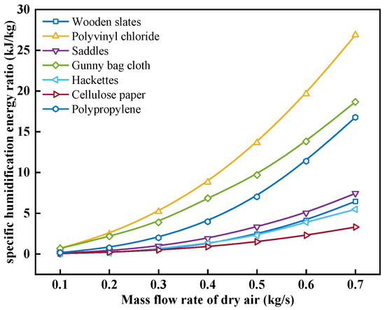 Figure 15 shows the effect of the air mass flow rate on the specific humidification energy ratio with different packing materials. As can be seen from Figure 15, with the increase in ma, the ηhum increase for each packing material increases, and the magnitude of this increase becomes more significant. When the ma increases from 0.1 kg/s to 0.7 kg/s, the ηhum increase for wooden slats, polyvinyl chloride, saddles, gunny bag cloth, hackettes, cellulose paper, and polypropylene increases from 0.03, 0.70, 0.09, 0.67, 0.05, 0.09, and 0.17 kJ/kg to 6.45, 26.87, 7.43, 18.67, 5.48, 3.30, and 16.77 kJ/kg, with an increase of 231.64, 37.38, 85.86, 26.80, 98.95, 35.34, and 99.15 times, respectively. Among the packing materials, polyvinyl chloride has the highest increase in ηhum as the ma increases, while cellulose paper has the smallest increase. The ηhum of cellulose paper is 0.09, 0.21, 0.48, 0.89, 1.49, 2.29, and 3.30 kJ/kg at the ma of 0.1, 0.2, 0.3, 0.4, 0.5, 0.6, and 0.7 kg/s, respectively. This is because the ηhum is determined by both the mhum and the energy required to overcome the resistance through the humidifier. mhum increases at a decreasing rate as the ma increases, while the energy required to overcome the resistance through the humidifier is approximately cubic to the ma as shown in Equation (24). Therefore, as the ma increases, the ηhum gradually increases, and the trend of increase is more obvious.