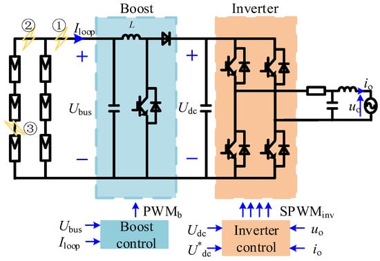 The typical structure of the two-stage inverter in the PV power generation system is shown in Figure 1 [36]. The first stage is a DC–DC converter, which achieves voltage boosting and MPPT function. The second stage is a DC–AC converter, which achieves the inverter and grid connection function, where Iloop and Ubus are the loop current and bus voltage. Udc and are the DC bus voltage and its target value. io and uo are the current and voltage of the grid side.