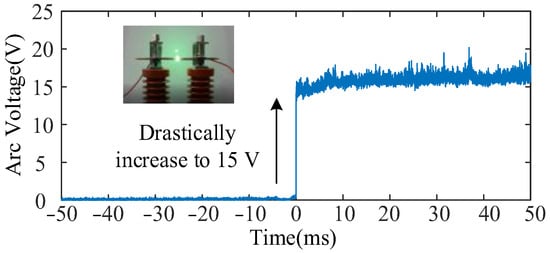 The DC arc can be equivalent to a nonlinear resistance; the arc gap’s length and current will affect the arc voltage [37]. Once the series arc ignites, the arc voltage drastically increases to 15 V, as shown in Figure 3. The Nottingham model can represent the voltage and current characteristics of the DC series arc after arc stabilization, as shown in (1).