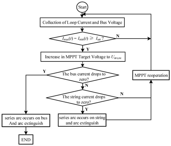 In summary, the proposed method utilizes the drop of the loop current to detect the series arc and extinguishes the series arc by increasing the target voltage to the Uarc,oc. This is shown in Figure 7, which illustrates the fault diagnosis process.