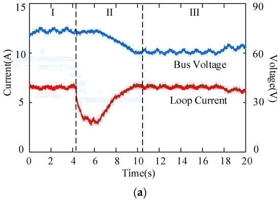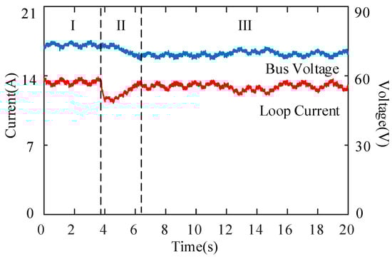 Under the converter without the proposed method condition, the waveform is as shown in Figure 9a. Stage Ⅰ (0–4.1 s) operates normally, and the bus voltage and loop current oscillate around the MPP due to the P&O method with a fixed step size. At 4.1 s, the series arc occurs. The bus voltage remains unchanged due to the PI controller, and the loop current drops to 3.5 A. In Stage Ⅱ (4.1–10.1 s), the MPPT algorithm increases the PV output power through disturbance. Stage Ⅲ (10.1–20 s) is influenced using the MPPT algorithm, and the PV system reaches the new MPP. Then, the bus voltage decreases by the arc voltage, and the loop current returns to the level before the occurrence of the series arc.
