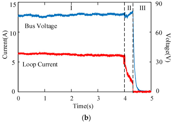 Under the converter with the proposed method condition, the waveform is shown in Figure 9b. Stage Ⅰ (0–4 s) operates normally, and the bus voltage and loop current oscillate around the MPP. At 4 s, the main PV bus causes the series arc fault, causing the loop current to drop by 3A. Moreover, the change in the current rate exceeds the threshold. In Stage Ⅱ (4–4.5 s), the series arc detection algorithm increases the target voltage of the MPPT algorithm in the next disturbance cycle. The bus voltage increases, and the loop current begins to decrease. In Stage Ⅲ (4.5–5 s), the series arc is extinguished when the loop current decreases to 1.5 A, and the position of the series arc opens circuit. Then, the bus voltage and the loop current drop to zero.
