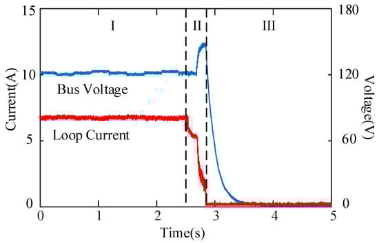 As shown in Figure 10, the bus voltage increases, and the loop current remains unchanged. Stage Ⅰ (0–2.5 s) operates normally, and the bus voltage and loop current oscillate around the MPP. At 2.5 s, the series arc occurs, and the loop current drastically decreases by 1.5 A. In Stage Ⅱ (2.5–2.9 s), the proposed method increases the target voltage of the MPPT algorithm in the next disturbance cycle. The bus voltage increases and the loop current begins to decrease. In Stage Ⅲ (2.9–5 s), the series arc is extinguished when the loop current decreases to 1.5 A, and the position of the series arc opens circuit. Then, the bus voltage and the loop current drop to zero due to the bus link open circuit.